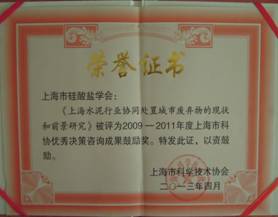 接着,会议宣读了《关于表彰上海市科协优秀决策咨询成果的决定》。有27家单位荣获上海市科协2009至2011年优秀决策咨询成果奖。我会承担的《上海水泥行业协同处置废弃物的现状和前景》调研课题获得鼓励奖。会上,还举行了简短的颁奖仪式。