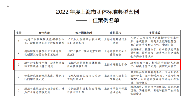 为积极探索“政府倡导、市场引导、行业主导、专业指导”的团体标准培育发展新模式,引导社会团体制定符合市场需求的团体标准,鼓励社会各界实施优秀的团体标准,促进高水平团体标准推广应用,根据《上海市市场监督管理局、上海市民政局(上海市社会组织管理局)、上海市工商业联合会关于开展2022年度上海市团体标准典型案例征集宣传活动的通知》(沪市监标创〔2022〕249号),经专家从团体标准典型性、实效性、创新性、示范性等角度遴选,最终确定了2022年度上海市团体标准典型案例“十佳案例”10项、“优秀案例”10项。其中,由中国科学院上海硅酸盐研究所牵头起草、上海市硅酸盐学会发布的团体标准《海洋地震勘探固体拖缆压电检波器》和《海洋地震勘探固体拖缆检波器用压电陶瓷元件》荣获2022年度上海市团体标准典型“十佳案例”荣誉称号。
