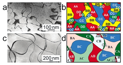 畴结构可用四色定理来理解,它们的图案及相关着色方案,与材料的磁特性密切相关。如图所示,a图中的晶体材料的畴结构,依照四色定理可染色为b图“模样”;而c图中第二种晶体材料,需依照特殊版本四色定理,染色后为d图,显示为红蓝绿三种颜色中的深色或浅色。