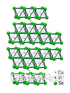 插入铜的铋硒化合物的构造。在铋和硒形成三角形的层之间插入铜