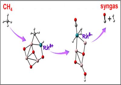在热轰击反应条件下,通过激光溅射生成的RhAl3O4+簇合物与CH4或CD4反应。原位质谱分析发现,Rh作为C-H键活化位点,在反应前后由正电性变为负电性。并且,在原本惰性的Al2O3中,少量Rh可以确保载体表面的O参与反应,把CH4氧化为CO。