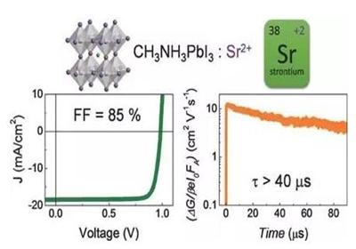 在MAPbI3钙钛矿太阳能电池中,通过Sr2+、FA(甲脒)、Bi3+、Cd2+和Ca2+等部分取代其中的阳离子,可以调控MAPbI3膜的电导性、半导体带宽等性质。本文系统研究了在MAPbI3中掺杂Sr2+对膜的形貌和光电性质的影响。掺入2%的Sr2+可以提高载流子寿命和收集效率,使得填充因子提升至85%.