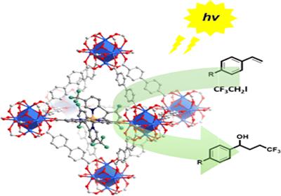 在UiO-67框架化合物中通过后处理的方式接上Ir化合物Ir(ppy)2,可以在可见光下催化苯乙烯类化合物的三氟乙氧基化。这种催化剂与均相前驱体有着不同的催化机理。空间限域效应可以大幅减少偶联副产物的生成,且该催化剂可以循环使用多次而催化剂结构不发生改变。