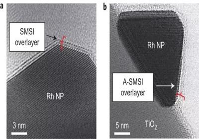 通过原位红外和电镜研究发现,在Rh/TiO2上,与单纯氢气高温还原产生的金属载体强相互作用不同,通过较高浓度的CO2+H2对样品进行预处理的过程中生成的HCOx物种可以吸附在载体上并形成O空缺,进一步使得还原物种迁移到金属表面。所形成的这层氧化物覆盖层仍然可以使气体通过,但是却减少C-H键的形成,从而生成更多的CO。