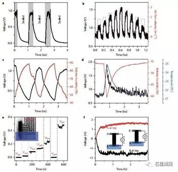 图2 |环境条件相关的蒸发诱导电位。 a,当烧杯被周期性密封和开封时装置的测量Voc。 b,在实验室环境中Voc(黑色)通过速度为1.9,2.2,2.4,2.6和2.9m s-1的风速(红色)增强。 c,在〜22℃的稳定环境温度下Voc(黑色)变化作为相对环境湿度(红色)的函数。 d,Voc(黑色)变化随环境温度(蓝色)和环境湿度(红色)而变化。 e,七电极装置(插图)的每两个相邻电极之间的饱和电压差,其中底部两个电极插入水中。电极的空间固定为5mm。 a,b和e中的环境温度为〜22℃,环境相对湿度在a和b中为〜70%,在e中为〜73%。 f,蒸发诱导电位器件的开关极性测试。当不改变电路连接,器件翻转时感应电压反转其符号。红色和黑色曲线分别是装置在翻转之前和之后的相应Voc。