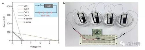 图4 | 蒸发诱导发电的缩放和应用。 a,四个单独的器件及其串联和并联连接的电流-电压曲线。 插图:电路图。 b,由四个串联器件驱动的液晶显示器照片。 每个器件以图1a所示的方式制造。