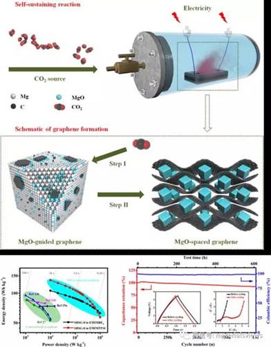 最近,中国科学院电工研究所马衍伟研究团队提出以二氧化碳为碳源,金属镁粉为还原剂,纳米氧化镁为模板剂,采用自蔓延高温合成技术,成功实现了兼具高导电性和高比表面积石墨烯粉体的快速、绿色和低成本制备。通过调控模板剂的量可以实现对石墨烯层数的控制,并揭示了自蔓延高温合成过程中石墨烯微观形貌的演化机制。所得石墨烯电导率高达13000 S m-1,比表面积达到709 m2 g-1,具有丰富的介孔结构,不仅促进了电子在电极/电解液界面的高效转移,也提升了离子在电极体相内的扩散性能。因此,在离子液体中基于电极材料的比电容最高可达244 F g-1;电流密度增大至500 A g-1时,容量仍维持113 F g-1。得益于优异的容量和突出的倍率性能,石墨烯电极表现出良好的大功率储能特性。功率密度为10 kW kg-1时,电极材料的能量密度高达136 Wh kg-1,在高达1000 kW kg-1的功率密度下,能量密度仍达60 Wh kg-1。此外,由于该石墨烯中氧元素含量仅为0.7 at.%,电极材料表现出异常优异的电化学稳定性,循环100万周后,容量保持率仍大于90 %。该研究与中科院理化技术研究所李江涛研究团队、中科院物理研究所李建奇研究团队合作完成。