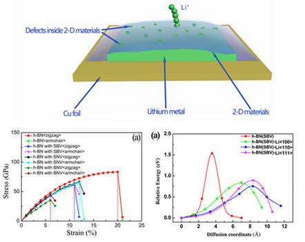 近期,北京航空航天大学的张千帆课题组与美国斯坦福大学的崔屹教授课题组展开合作,应用第一性原理计算模拟的方法从理论上研究了多种二维层状材料(六方氮化硼、石墨烯、硅烯、锗烯、锡烯、黑磷、硒化锡和硫化锡等)作为锂金属或者钠金属电极表面保护膜的可行性以及影响它们保护效应的重要因素。研究发现,缺陷类型、晶体结构、键长与键角和金属近邻效应等因素影响了二维层状材料内的电子之间的相互作用以及电荷的分布,进而影响了保护膜的扩散性能和机械性能。缺陷的引入、键长的增加和金属的近邻效应都对锂(钠)离子的扩散具有积极影响,可以降低扩散势垒和提高扩散速率。但同时,这些因素都会对二维层状材料的硬度和弹性产生消极影响,从而不利于抑制枝晶化现象。因此,在寻找二维层状材料作为保护膜时,既要考虑离子的电导率来提高电化学性能,又要保证二维材料的强度来抑制锂枝晶,需要在二者之间做出合理的取舍。