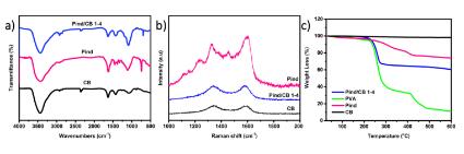 b) 聚吲哚、炭黑和聚吲哚/炭黑(质量比1:4)复合材料的Raman图