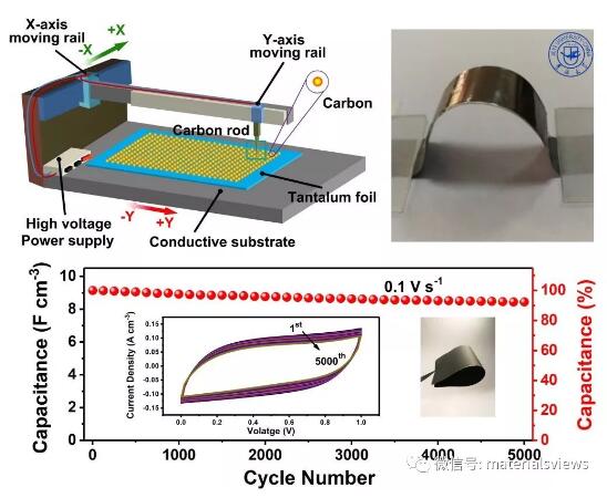 吉林大学王丽丽副教授课题组和韩炜教授课题利用具有无毒,高稳定性和优异导电性的金属Ta可同时满足用于水系和有机系等超级电容器电解质,应用范围广泛。此外,具有诸如强延展性,可弯曲性和机械稳定性等重要特征的Ta箔可用作制造固态柔性装置的电极基板。针对导电基板和活性材料之间的不稳定界面导致低导电性和较差的器件性能等问题,研究者采用新型电火花放电可印刷方法制造了一种高性能柔性储能平台。在Ta箔与粘合剂接触的近表面层中打印嵌入碳颗粒阵列,不仅增加导电基底的表面的粗糙度,增强电极各层之间的机械稳定性;而且缩短了电荷传输路径,增加了电极层间导电性,从而提升电极的整体性能。由于Ta箔表面上的印刷碳处理,碳膜堆叠的附着力得到了大大增加,制造出在其表面上具有印刷碳颗粒的Ta-C-carbon film电极,开发出具有增强的储能性能和改善柔韧性的高性能超级电容器。