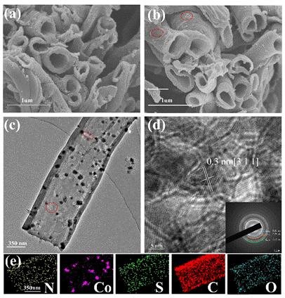 针对上述问题,东华大学材料科学与工程学院李光研究员团队采用同轴静电纺的方法,将钴(Co),氮(N)和硫(S)引入到多孔中空碳纳米纤维中(HPCNF),经过热处理之后,成功制备了含有Co9S8纳米颗粒、N和S共掺杂的中空碳纳米纤维(Co9S8-NSHPCNF)(图1)。