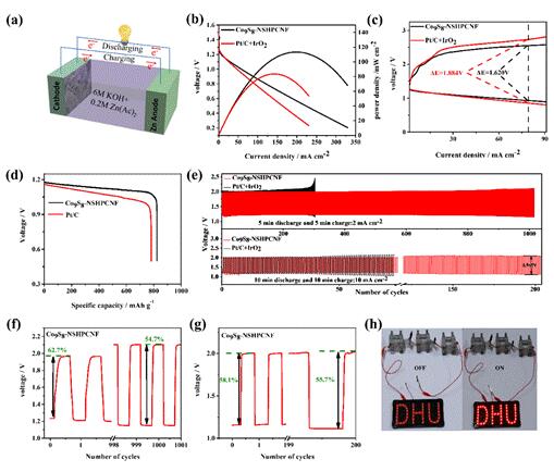 由于Co9S8纳米粒子与HPCNF之间的协同作用,较高的比表面积、多孔和中空结构、N和S的掺杂以及良好的导电性,制备出来的Co9S8-NSHPCNF对ORR和OER同时表现出优良的催化性能和耐久性。以Co9S8-NSHPCNF为空气阴极组装的锌空气电池放电峰值功率密度(113 mW cm-2)高于Pt/C (80 mW cm-2),循环稳定性优良(图2)。