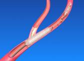 介入治疗就是不开刀暴露病灶的情况下,在血管、皮肤上作直径几毫米的微小通道,或经人体原有的管道,在影像设备(血管造影机、透视机、CT、MR、B超)的引导下对病灶局部进行治疗的创伤最小的治疗方法。冠心病介入治疗不是外科手术而是一种心脏导管技术,具体来讲就是把支架安装在球囊导管上,通过大腿根部的股动脉或手腕上的桡动脉,将球囊导管输送到血管病变处,由压力泵注入液体使球囊扩张,进而撑开支架及病变狭窄处的血管,撤出球囊导管,支架置于病变处,达到扩张狭窄血管、恢复血液流通的目的(图3)。根据支架表面处理情况,支架可分为裸露型(图4)、涂层型和覆膜型;根据材质,支架分为金属支架及可降解的高分子支架。金属支架在进入临床治疗后取得了令人瞩目的疗效,但是经过十多年的应用也逐渐暴露出一些金属支架的不足和弊病,如易致血栓形成,再狭窄率高,造成血管壁损伤等问题。再狭窄的主要原因可能是由于金属支架压迫血管导致支架内局部或广泛的内膜组织增生,包括血管平滑肌细胞和内膜增生。针对以上不足,一方面患者在介入手术后要口服一些抗凝血的药物;另一方面科技工作者积极研发一些阻止细胞增生的支架如药物洗脱支架及生物可降解支架。有数据表明:金属裸露型支架表面仅作抛光处理,再狭窄率为15%-30%;涂层型是在金属表面涂以肝素、氧化钛等物质;覆膜型即在金属支架外表覆以可降解或不可降解的聚合物薄膜,这些药物涂层支架的应用进一步改善了支架术的长期疗效,一般人群再狭窄率3%,糖尿病/复杂病变约为10%,其效果可与冠状动脉搭桥手术相媲美。