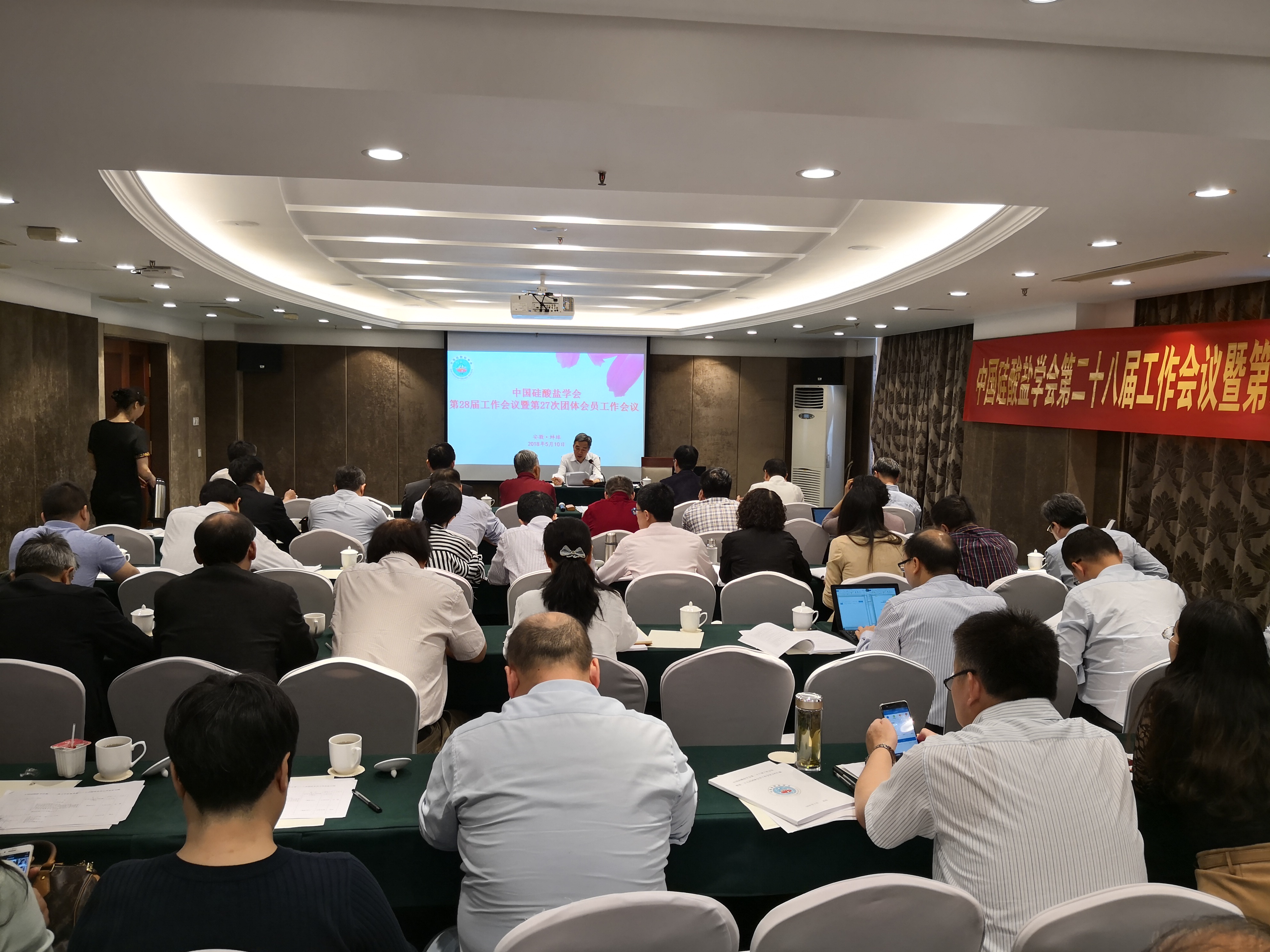 中国硅酸盐学会第二十八届工作会议暨第二十七次团体会员工作会议,2018年5月9日在安徽省蚌埠市召开。中国硅酸盐学会名誉理事长张人为、蚌埠玻璃工业设计研究院常务副院长马立云、中硅会副理事长兼秘书长晋占平以及各专业分会、地方学会及部分团体会员单位的代表参加了会议。中硅会副秘书长刘捷、谭抚主持会议。