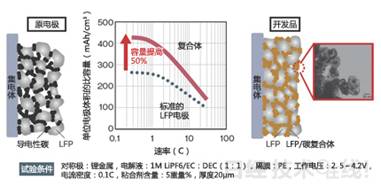 与东京农工大学推进共同研究的日本贵弥功利用超速离心处理制作了微细粒子,并打算利用该技术使空心碳中含有正极活性物质的导电材料实用化(图C-2)。利用含有LiFePO4的空心碳提高电极密度,“能将单位体积的能量密度提高50%”。通过将LFP与碳材料的复合体用于导电材料,可提高电极密度,将单位体积的能量密度提高50%。