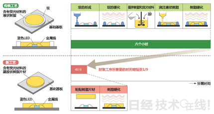 图2中传统工艺与新工艺在封装工序上的比较。*2。传统工艺通过含有荧光材料的液状树脂来封装LED元件。首先,在基板上的LED元件周围形成用来阻挡树脂流出的“坝”,并使其硬化。然后,搅拌液状树脂与荧光材料、浇注到基板上的坝内。最后,对浇注的树脂进行热硬化处理。整个封装工序所需要的时间约为六个小时