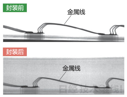 连接LED元件电极和基板电极的金属线,在通过凝胶状片材封装LED元件前后几乎没有变形,不会造成损伤等不良影响。由本刊根据日东电工的资料制作。
