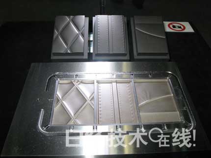 牧野铣床制作所的方法是:首先利用可制作和编辑STL格式数据的创意设计用软件CAD(“freeform”等)制作咬花形状的CAD数据;再将CAD数据导入该公司的CAM软件“STLCAM”,输出用于切削石墨电极及切削模具(粗加工)的NC数据;然后,根据该NC数据制造石墨电极,同时切削(粗加工)作为模具材料的钢块;最后,用石墨电极对已完成粗加工的钢材进行放电加工,以形成包括纹路在内的最终形状。从该公司在此次展会上展出的模具(腔体)试制品也可以看出,可以在成型品上形成皮革般的纹路(图1)。