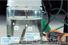 在水电解中,用于阴极和阳极的新型催化剂是不同的。阴极用催化剂是将镍(Ni)与其氧化物(NiO)的复合粒子附着在氧化多壁碳纳米管(MWCNT)上而制成的(图1)。阳极用催化剂是由镍铁(Fe)合金构成的层状双氢氧化物(LDH)。这种新型催化剂是由斯坦福大学化学系教授戴宏杰的研发小组开发的。