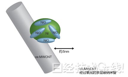 MWCNT是在Ni粒子上附着NiO粒子使用的载体。没有MWCNT时,在相同条件下,NiO粒子不会附着,Ni粒子会长大注1)。