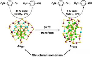 尽管这两种Au38金属纳米粒子组成完全一样,但是其同分异构体具有明显不同的催化活性:Au38T能够在低温(0℃)催化对硝基苯酚的还原,30分钟内可获得44%的产物,并且可循环使用15次以上;而Au38Q在同样的条件下,却不能催化该反应(图2)。此外,这两种Au38异构体之间能发生转化:在50℃条件下,Au38T会不可逆地慢慢转化成Au38Q(图2)。有关研究还在进一步探索中。
