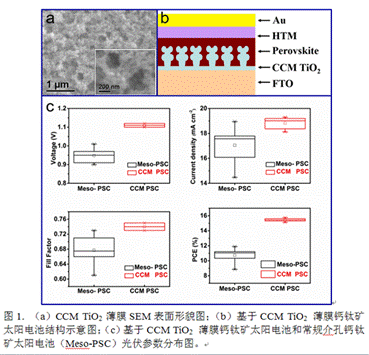 该研究组张旭辉等针对上述问题,采用一步法制备TiO2致密介孔连续层(CCM)。通过一次旋涂致密介孔连续层前驱体溶液后退火处理,在导电基底上获得一层连续的致密介孔层(下半部分致密、上半部分为介孔。其表面形貌及电池结构见图1a,b),同时起到了空穴阻挡和充当电子传输骨架层的作用。特殊多孔洞介孔层的形成,更有利于钙钛矿层的沉积。由于致密空穴阻挡层和介孔层是一步法制备并且连续,没有传统介孔钙钛矿太阳电池致密空穴阻挡层和介孔层之间层与层的接触,因此更有利于电子在TiO2膜内的传输,减少了电子复合,其光电转换效率从11.90%提高到15.76%。同时,由于CCM TiO2层更加均匀,制备相对于传统介孔钙钛矿电池大大简化,因此电池的一致性也得到了很大的提高(图1c)。相关研究成果对今后发展新型高一致性介孔钙钛矿太阳电池具有一定的参考意义。