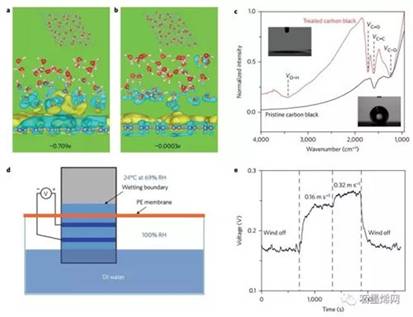 图3 | 蒸发诱导电的原因。 a,b,由三层水(黄色,获得电子;蓝色,失去电子)覆盖的功能性C-O-C石墨烯(a)和原始石墨烯(b)中的电荷再分布。等值面设定为0.00015e-3。水接触感应电子再分布在碳层中的每个面板底部标记。 c,原始(黑色)和退火且等离子体处理(红色)CB的FTIR光谱。 插图是原始CB(右下)和退火且等离子体处理的CB(左上)的水接触角图像。 d,多孔CB片材中蒸发诱导流动效应的实验装置。 具有两个间隔为5mm的CB片电极下半部通过PE膜密封在烧杯中,而CB片的上半部暴露于环境空气。 e,上半部分在不同风速下的水蒸发在两个电极之间感应出电压。