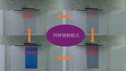电致变色是电致变色材料的光学属性在外加电场的作用下发生稳定、可逆的变化的现象,在外观上表现为颜色和透明度的可逆变化。由电致变色材料做成的电致变色器件已经广泛应用于智能窗、汽车观后镜、电致变色显示器等领域,其中应用最为广泛的是电致变色智能窗,它可以通过改变电压而使窗户呈现不同的透明度,为人们营造健康舒适的光环境,如美国波音787客机的客舱窗就使用了电致变色玻璃。然而传统的电致变色玻璃的设计大多是追求对可见光谱的调节能力,即改变外加电压产生肉眼可辨的颜色变化,对热量产生的根源——红外光的调控空间有限。理想的电致变色玻璃应既有低反射率性质以利冬天保温,又能阻隔室外热量以减少夏季空调负担,并在此基础上实现光与热的独立调控,即让窗户分别拥有亮模式、暗模式以及热模式、冷模式的状态,这就需要对可见、近红外双波段实现独立调控。