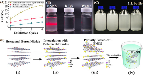 六方氮化硼纳米片,也称“白色石墨烯”。由于结构相似,石墨烯和氮化硼纳米片具有类似性能,如优异的机械和热性能,尤其是导热性能。虽然石墨烯在导热应用方面已开展了广泛研究,但因其导电性限制了石墨烯在绝缘领域的应用。相比之下,氮化硼纳米片具有良好的电绝缘性,因此特别适用于导热绝缘领域中的散热材料。虽然氮化硼纳米片有诸多优异性能,但迄今为止,其研究和应用却远不如石墨烯,这主要是由于缺乏高效、低成本制备氮化硼纳米片技术。由于氮化硼层与层之间的作用力远比石墨烯之间的作用力强,因此通过液相剥离六方氮化硼粉体制备纳米片更具挑战性。到目前为止,虽然已有球磨、插层和化学剥离等制备氮化硼纳米片方法,但仍存在能耗较大、制程时间较长、产率较低以及需要使用昂贵或毒性化学试剂等不足之处。