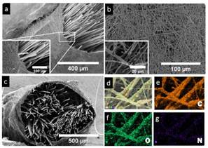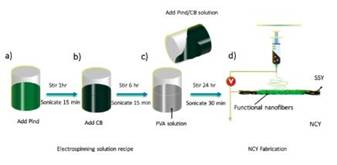 d) 静电纺制备线型电极,其中 SSY为stainless steel yarn,NCY为nanofiber coated yarn