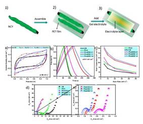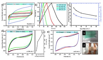 a) 聚吲哚/炭黑(质量比1:4)复合纳米纤维超电在不同扫描速率下的CV图,b) GCD图,c) 面积比电容和线性比电容,d) 循环性能图和 e) 柔性测试―不同编织方式下的CV图