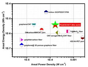 图6 与其他线型超级电容器的面积功率密度和能量密度对比图