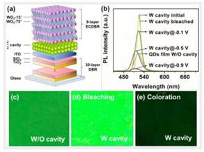得益于光子晶体独特的光学性质及WO3材料优异的电致变色特性,该光子晶体带隙可以在小的驱动电压下(±1.1 V)实现快速、宽范围的可逆调控。在此基础上,进一步将电致变色反射镜整合到光学微腔中,成功实现了可逆电调谐的微腔量子点发光器件。在-0.9 V电压下,该微腔器件的发射峰位,峰值强度和半高全宽的最大调制范围分别达到15.5 nm,317%和10.4 nm。