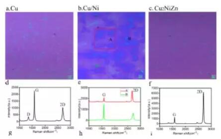 近日中国科技大学和大连理工大学的科技工作者[1]合作使用三元铜、镍、锌合金作为催化剂和基底成功地以液态正己烷为碳源制备得到了单层石墨烯。与单一的铜或者二元的铜镍合金不同的是,三元合金催化制得的石墨烯质量更高,如下图1所示。不同寻常的是,他们没有正面探究正己烷的供给方式,而是通过控制基底的种类和成分来控制石墨烯的形核生长,进而达到制备高质量石墨烯的目的。碳原子在高温下可以以较大浓度溶于镍中,通过快速降温可以使碳以石墨烯层片的形式析出在镍的表面,从而形成较厚且不均匀的石墨烯。但是碳在铜中的溶解度极低,根据其表面限制的催化生长机理,在高温时,碳原子可以在铜的表面形核生长成连续的单层石墨烯膜。如果将铜和镍的优势结合起来,使用配比优化的铜镍合金为催化基底,可以获得大尺寸的单晶石墨烯。据他们的理论计算结果,合金引起的协同效应,提供了一个理想的金属平台,使烃分子更容易脱氢裂解,合理地加强了碳单体在基底表面吸附能,同时降低了形成碳碳键所需的能量,在很大程度上促进了具有高电子迁移率和低缺陷密度的单层石墨烯的生长。