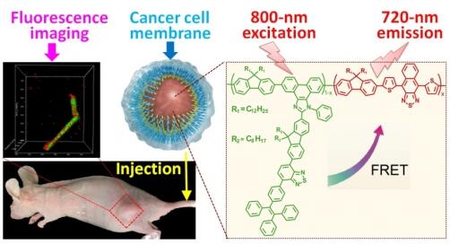 在前期工作的基础上,田志远课题组在近日设计并合成了将具有双光子激发特性的能量捕获单元和能发射NIR荧光的能量受体单元集成到了聚合物分子链中的新型嵌段共聚共轭聚合物,并基于这种光学活性聚合物构建了肿瘤细胞膜包覆的、可实现NIR光激发、NIR荧光发射的“NIR input-NIR outgoing”的仿生荧光探针。这种荧光探针以波长在具有最大光通透性的生物窗口范围的光(700-1000nm)为激发源且具有双光子激发荧光(two-photon excited fluorescence,TPEF)特性,无需将能量给体与受体进行掺杂,在确保探针结构稳定性的前提下实现高的荧光成像穿透深度。该探针所具有的高度特异性靶向能力及对活体肿瘤的高清晰度荧光成像能力在模型荷瘤小鼠实验中得到了充分验证。