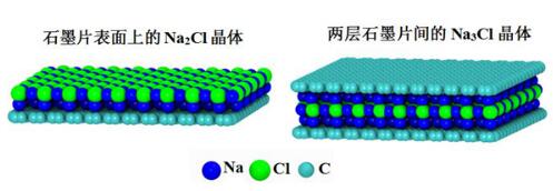 氯化二钠、氯化三钠晶体的发现,颠覆了我们中学教科书中常温常压条件下,食盐晶体中钠氯元素比总是1:1的常识(分子式NaCl)。这一发现的关键是上海应物所团队近十年发展的新理论:溶液中水合离子与具有大量芳香环的表面(例如石墨、石墨烯、碳纳米管等)之间存在强水合离子-π作用。在这个理论指导下,他们已经取得了包括“离子精确装订石墨烯膜用于离子筛分”等系列工作[Sci. Rep. 2013, 3, 3436; Sci. Rep. 2014, 4, 6793; Phys. Rev. Lett. 2015, 115, 164502; Phys. Rev. Lett. 2016, 117, 238102; Nature 2017, 550, 380]。在溶液中,由于离子的水合,阳离子与富含π电子的芳香环之间的水合离子-π作用曾被普遍认为比较小,甚至可以忽略不计。考虑到溶液中的多离子效应和表面上的多芳香环结构,他们提出了水合离子与具有大量芳香环的表面之间依然存在强相互作用,水合离子因此会较强地吸附于具有大量芳香环的表面,导致表面上大量离子的富集[Sci. Rep. 2013, 3, 3436];由于离子间相互作用和热扰动,当溶液中盐离子达到一定的浓度时,表面富集足够多的阴阳离子会呈周期性排列,形成二维晶体;考虑到阳离子与芳香环之间的作用远强于阴离子与芳香环之间的作用,表面吸附的阳离子会比阴离子更多,因此得到的晶体包含更多的钠,形成氯化二钠和氯化三钠。他们用量子力学计算预言了这样的晶体结构,并采取XRD、EDS和EELS等实验手段,在浸泡于半饱和氯化钠溶液的石墨烯膜和天然石墨粉表面,证实了氯化二钠和氯化三钠二维晶体的存在。