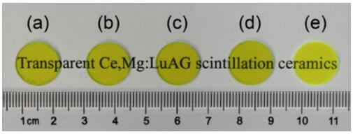 不同温度退火的LuAG:Ce,Mg闪烁陶瓷实物照片:(a)未退火、(b)1000摄氏度、(c)1100摄氏度、(d)1300摄氏度、(e)1450摄氏度