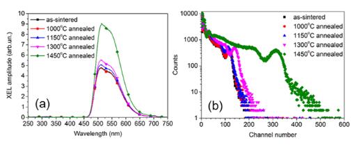 同温度退火LuAG:Ce,Mg陶瓷的X射线激发谱(a)与脉冲高度谱(b)