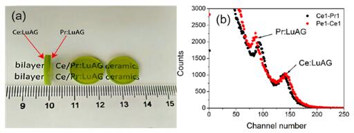 LuAG:Ce /LuAG:Pr复合陶瓷闪烁体的实物照片(a)与脉冲高度谱(b)