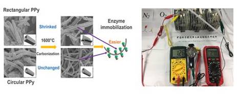 目前,三维碳纳米复合材料主要由大量一维、二维碳纳米材料混合组成,整体结构中界面原子所占比例较高,导致界面接触电阻较大、导电率较低,从而影响电极性能。近日,中国科学院天津工业生物技术研究所体外合成生物中心研究员朱之光带领的团队针对这一问题,开发了一种连续型三维碳纳米复合材料,用于生物电极的制备和生物燃料电池的应用。该研究通过高温碳化一种方管型结构的导电聚合物(聚吡咯),使其形成连续型的三维碳纳米材料,具有优异的导电性。同时该方管材料的四壁经高温塌陷,很好地为酶提供了附着点,提高了材料的表面积和生物兼容性。在固定葡萄糖氧化酶和漆酶之后,构建的葡萄糖/氧气生物燃料电池具有1.16V电压和0.35mW/cm2的输出功率,在2mA条件下可持续放电50小时以上,并点亮LED灯。该研究为新型三维碳纳米材料的构筑及其在生物电化学系统中的应用提供了新思路和新方法。