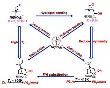 如图所示,从非铁电母体有机—无机杂化ABX3型钙钛矿[(CH3)4N] [Ni(NO2)3]出发,结合似球—非球、氢键、托氟效应等理论,通过化学合成对阳离子进行修饰,最终将高对称球形阳离子[(CH3)4N]+修饰为准球形阳离子[FMeTP]+。具体而言,通过引入庞大的氮杂双环结构大大降低了分子对称性,同时羟基的引入能够提供氢键相互作用,最具电负性的F原子取代H原子可以进一步调节晶体堆积。