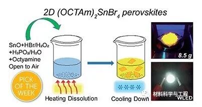 图1. 酸性溶液中合成2D (OCTAm)2SnX4钙钛矿发光材料和白光LED中应用。