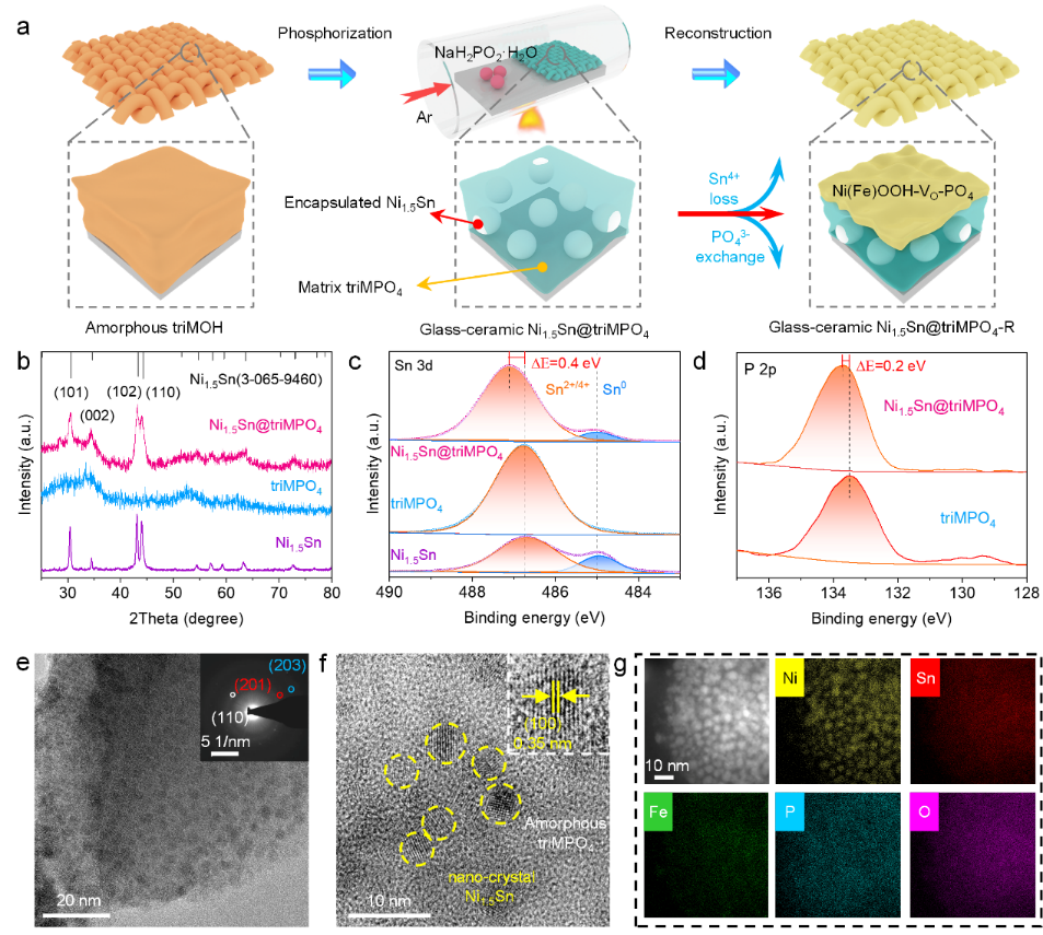 最近,中国科学院上海硅酸盐研究所王家成研究员课题组制备出一种具有结晶-非晶双相结构的微晶玻璃(Ni1.5Sn@triMPO4)并用于电催化OER。该研究成果以“A glass-ceramic with accelerated surface reconstruction toward the efficient oxygen evolution reaction”为题发表在学术期刊Angewandte Chemie International Edition上,并且被选为Very Important Paper (VIP)。文章共同通讯作者为王家成研究员,马汝广副研究员和北京工业大学刘丹敏研究员。